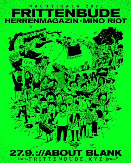 samstagnachmittag kommt die nachtigala zurück auf unsere gartenbühne! den abriss des letzten jahres, als die gala im zeichen des cracks und der einmaligen rückkehr von captain capa stand, möchten die beiden pteranodons der frittenbude nun ein weiteres mal abscheppern. unter dem blätterdach unseres gartens erwarten euch nicht nur die pandabären zum affentanz, sondern auch so einige highlights aus der gefühlt längsten bandgeschichte aller zeiten. als gäst*innen sind diese jahr queerhop-aktivistin mino riot und dj valeria aus sabrigge (saarbrücken) als eröffnungs act dabei und, kaum zu glauben, aber auch ein paar olle friends aus hamburg, die dieses jahr mit wohl großem album ihr comeback feiern, sind mit im boot: herrenmagazin! das wird kein ritt ins unbekannte, sondern ein feuchtfröhlicher ausrutscher richtung sonnen- und mackeruntergang. sattelt eure unicorns, otten und triceratops und ab geht's schon am späten nachmittag und tief in die nacht hinein, bis das ://summer closing übernimmt. alle dürfen bleiben bis in die sonntagnacht: