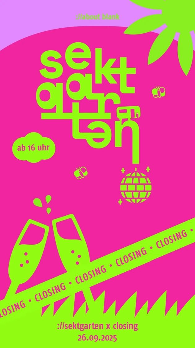 - ://about sektgarten x closing 26.09.2025 // brat party 26.09.2025 // nachtigala 2025 27.09.2025 // blank off summer 27.-28.09.2025, news [://about blank], 26.09.2025