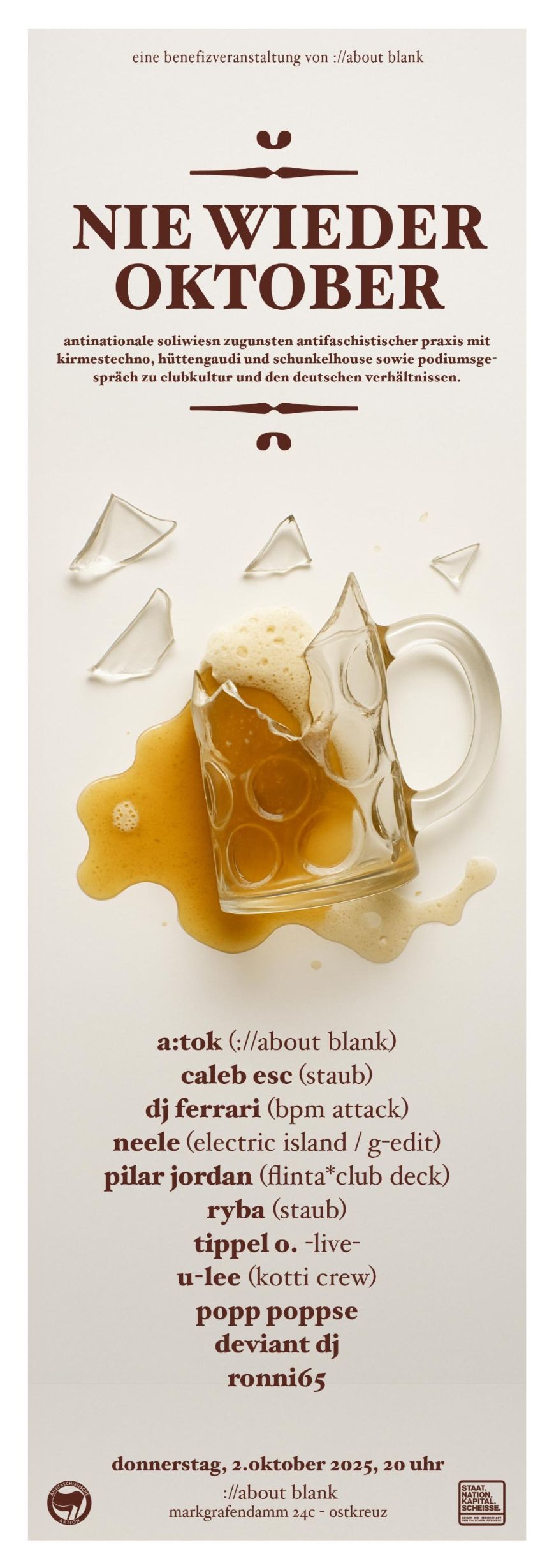 wie es von hier aus weitergehen soll im kaltschnäuzigen deutschen herbst, beantworten wir schon an diesem donnerstag, dem vorabend des von uns seit eh und je gering geschätzten feiertags der einheitsdeutschen, mit: nie wieder oktober. unsere alljährliche antinationale benefizklatsche anlässlich jedweder oktoberfestlichkeiten räsoniert über staat, nation, kapital und über das, was einer zersplitterten, irrlichternden und populistisch aufgeheizten linken verloren gegangen ist. in zeiten rigoroser abschottungspraxis und massiver aufrüstungspolitik, der kriminalisierung antifaschistischer strukturen und superspreadendem antisemitismus sowie der ökonomischen zuspitzung stehen linke veranstaltungsorte unter existenziellem dauerdruck. angesichts von autoritärem wahn, rassistischen mehrheiten und instrumenteller vernunft rückt eine vergesellschaftung jenseits nationaler kollektive und ethnischer zuschreibungen auch auf dem dancefloor ins hoffnungslos utopische. für eine linke clubkultur zugunsten identitätspolitischer schiffbrüchigkeit und zur sabotage obsessiver feindbildkonstruktionen laden wir daher zur antinationalen soliwiesn für antifaschistische praxis mit kirmestechno, hüttengaudi und schunkelhouse. in einem podiumsgespräch wollen wir mit vertreter*innen des conne island (leipzig), objekt klein a (dresden) und artists against antisemitism zu clubkultur und den deutschen verhältnissen sprechen, begleitet von text und musik von tippel o.