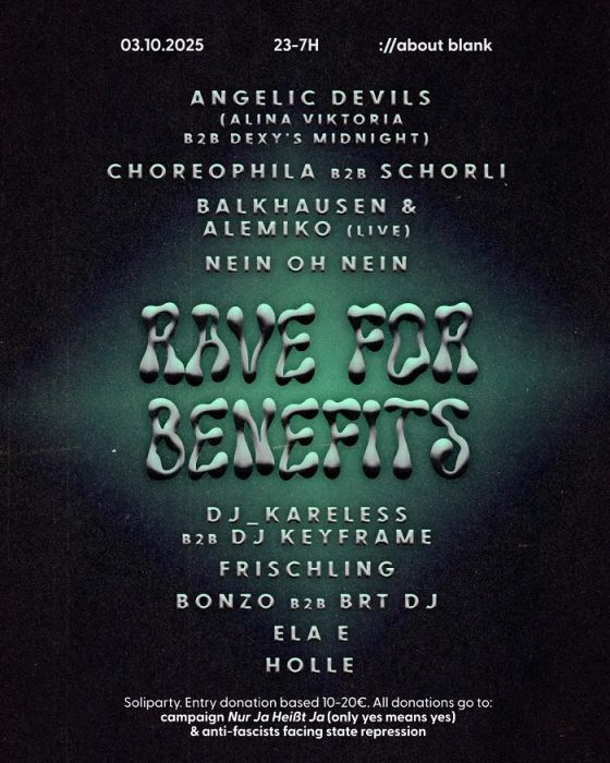 in der anschließenden freitagnacht verbinden rave for benefits ekstase mit gutem zweck verbinden. zwanglos. unkommerziell. soliparty. gespendet wird für von repression betroffene antifaschist*innen & die kampagne "nur ja heißt ja"!