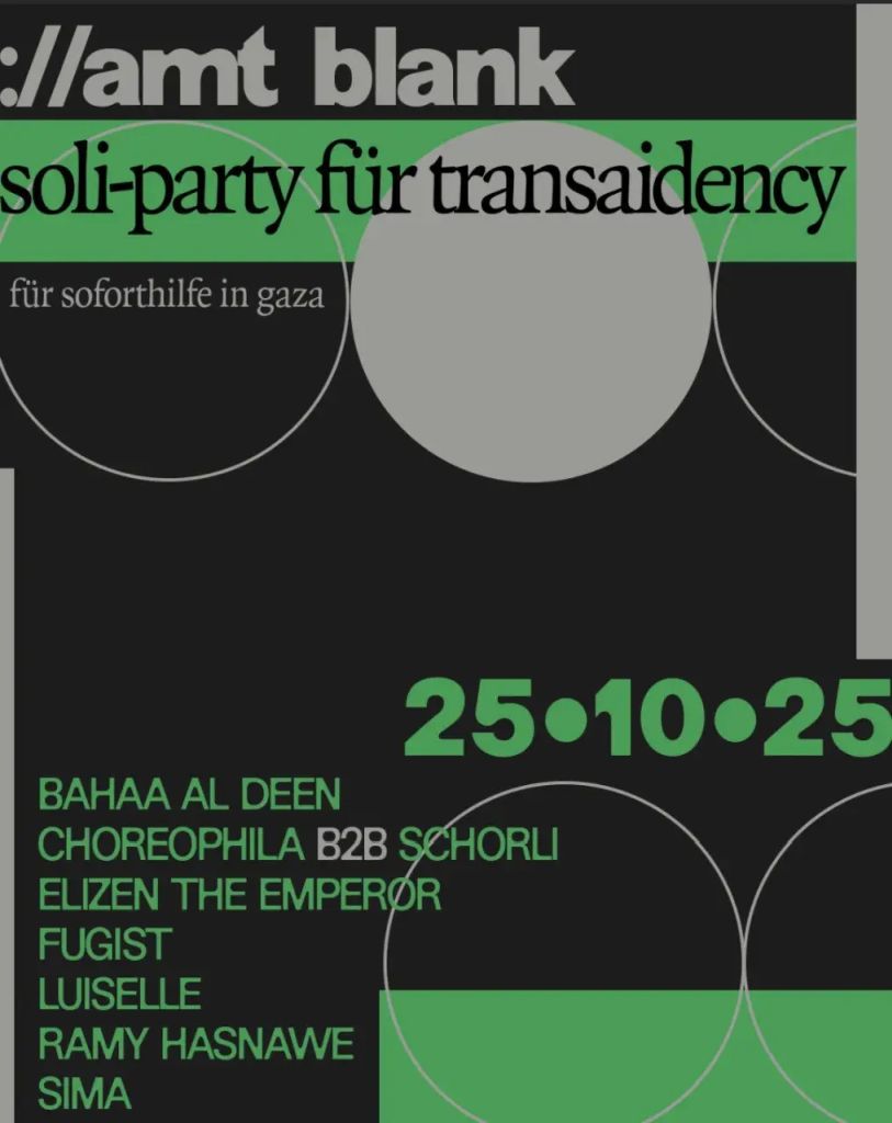 in der anschließenden samstagnacht springt das altehrwürdige ://amt blank mal wieder kurzfristig ein. diesmal mit einer soliparty für transaidency. die humanitäre laga in gaza ist auch nach dem ende des krieges katastrophal. transaidency ist für multiperspektivische bildungs- und dialogarbeit von jouana hassoun und shai hoffmann zu israel und palästina und humanitäre hilfsaktionen bekannt. aktuell sammelt der verein soforthilfen für die zivilbevölkerung in gaza und unterstützt vor ort die vulnerabelsten menschengruppen durch die versorgung mit lebensmitteln, sauberem wasser und notunterkünften.
