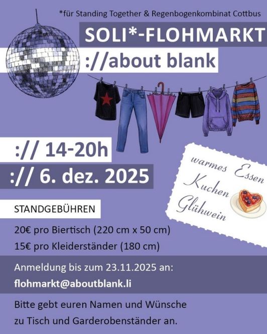 in einem monat ist schon adventszeit und das bedeutet auch: endlich wieder soliflohmarkt im blank! dieses jahr am 6. dezember von 14 bis 20 uhr mit warmem essen, heiß- & kaltgetränken, kaffee & kuchen und verschiedenen dj-sets. wie jedes jahr gehen die einnahmen an unterschiedliche projekte, dieses jahr an standing together und das regenbogenkombinat cottbus. bitte schickt eure anmeldungen unter angabe von name und reservierungswunsch bis zum 23. november an: adresse@verborgen - wir freuen uns!
