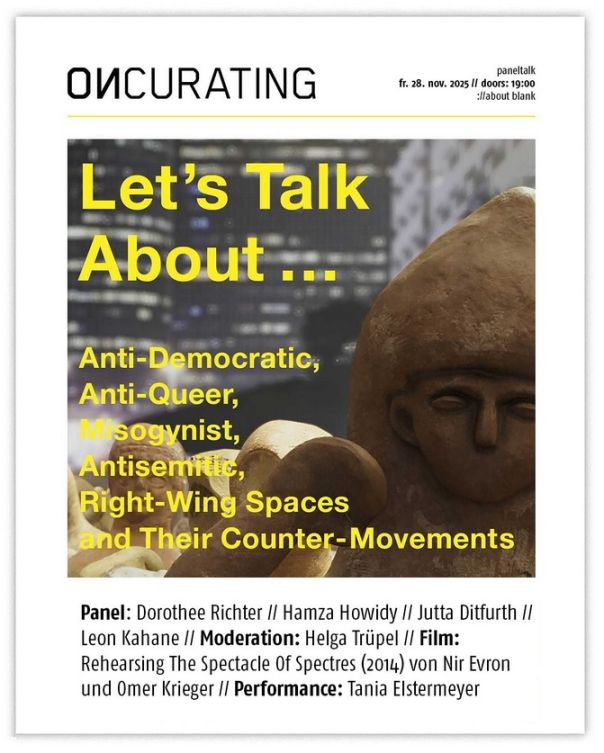 auch am freitagabend wird es diskursiv, wenn aus anlass der veröffentlichung von ausgabe 62 der zeitschrift oncurating über antidemokratische, anti-queere, misogyne, antisemitische, rechtsgerichtete räume und ihre gegenbewegungen gesprochen werden wird. die ausgangslage: es gibt eine globale bewegung hin zu autoritären, patriarchalen ideologien, die misogyn, queerfeindlich, rassistisch und nicht zuletzt antisemitisch sind. sie greift auf bizarre, ideologisch aufgeladene und verdrehte narrative zurück, die differenzierungen, widersprüche und historische ereignisse ignorieren – angeheizt durch algorithmen, die geschlossene weltanschauungen begünstigen. dies geschieht nicht nur in autoritären staaten, diktaturen und kleptokratien (siehe russland), sondern auch – getarnt als soziale bewegungen – in neoliberalen demokratien. die von nathan sznaider geforderte toleranz gegenüber mehrdeutigkeit, d. h. das erkennen und aushalten von widersprüchen, ist dabei weitgehend verloren gegangen. indem wir in diesem podiumsgespräch intellektuelle, interkulturell-künstlerische und kuratorische positionen vorstellen, möchten wir dieses lagerdenken in kunst und kultur hinter uns lassen. der panel-talk mit jutta ditfurth, hamza howidi, leon kahane und herausgeberin dorothee richter wird von helga trüpel moderiert. vorab wird der kurzfilm "rehearsing the spectacle of spectres" aus dem jahr 2014 von nir evron und omer krieger gezeigt, in dem der 1946 gegründete und am 7. oktober 2023 durch den angriff der hamas zerstörte kibbuz be´eri nahe dem gazasstreifen portraitiert wird. außerdem wird es eine performance der künstlerin tania elstermeyer, beauftragte für antisemitismusarbeit an der hdk, geben. die veranstaltung findet in englischer sprache statt.