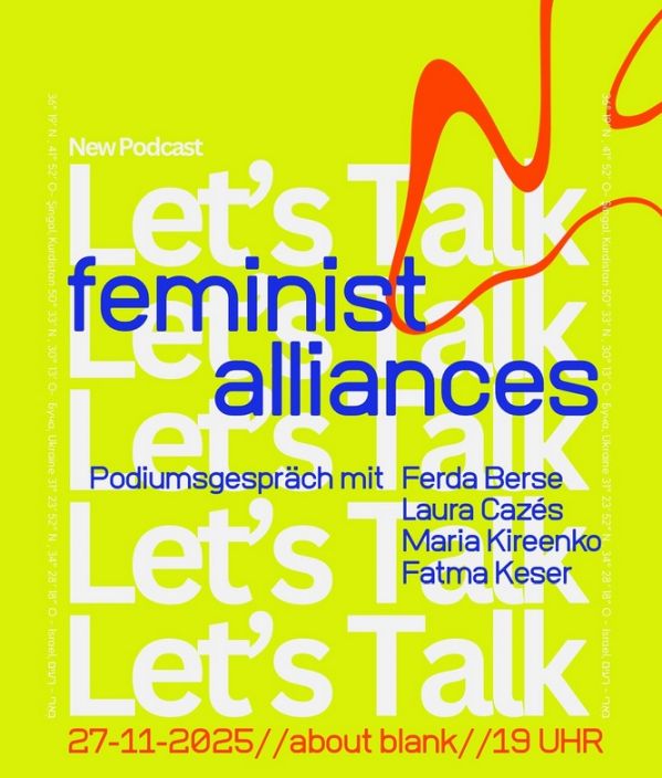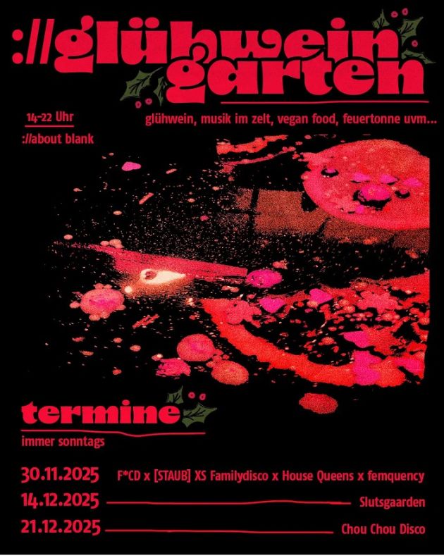 - ://about feminist alliances 27.11.2025 // oncurating#62 28.11.2025 // flinta* club deck 28.11.2025 // für immer ://blank – dualism soliparty 29.11.2025 // glühweingarten 30.11.2025, news [://about blank], 27.11.2025