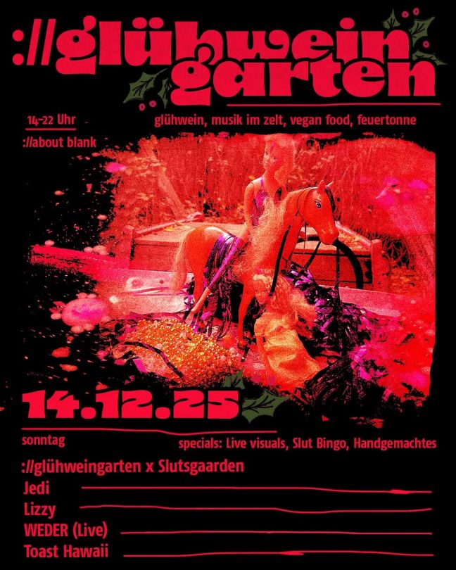 und der sonntag? da ist wieder ://glühweingarten: heiße tassen, no last christmas, rentiere müssen draußen bleiben! bock auf wintermarkt mit guter musik und ohne viel gedöns? we got you! kommt bei freiem eintritt in den schönsten garten der stadt. euch erwarten ein beheiztes zelt zum dancen, eine feuertonne zum wärmen und eine glühweinhütte mit heißen drinks sowie veganes essen von hen catering. das musikalische und visuelle programm gestaltet diesmal das burner kollektiv slutsgaarden, die u.a. ein slut bingo anbieten. es wird also doppelt heiß.