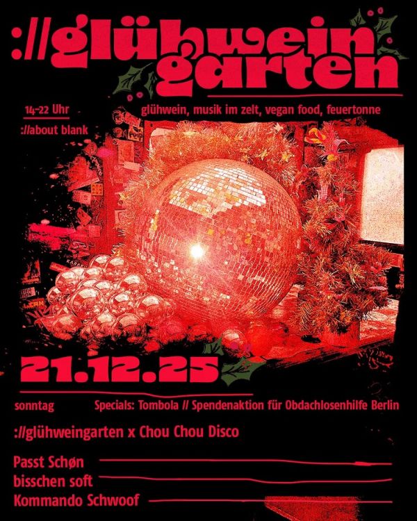 - ://about pudding + letzte wiese 19.12.2025 // antihour 20.12.2025 // brat party 20.12.2025 // glühweingarten x chou chou disco 21.12.2025, news [://about blank], 19.12.2025