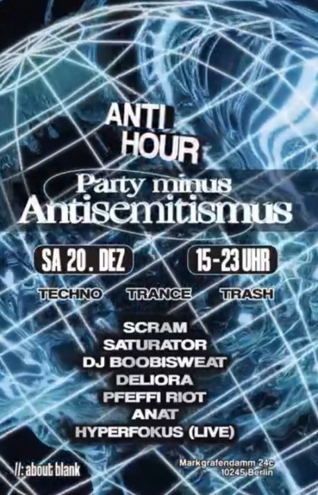 samstag, tagsüber: techno, trance und trash auf zwei floors. die dritte antihour kommt zum einjährigen zu unserer großen freude wieder zu uns ins haus mit einer winteredition! techno gibt es in der lobby, hypnotisch-treibend oder düster und hart. trance und trash hingegen auf dem special-backstage-floor. sieben acts und zero bock auf antisemitismus. kommt früh, bleibt bis zum ende. bringt eure friends und genoss*innen mit. der deutsche winter hat keine chance.