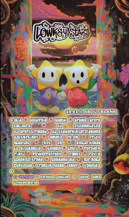 die spannendsten newcomer*innen der berliner szene präsentiert lowkey stars in der neujahrsparade samstagnacht. das konzept: community building statt headliner-mentalität. hier haben neue gesichter die chance, in einem professionellen umfeld aufzulegen. kommt in bunten outfits, es gibt früchte und süßigkeiten und ein all-well-ness-team sorgt dafür, dass ihr eine wunderschöne zeit habt.