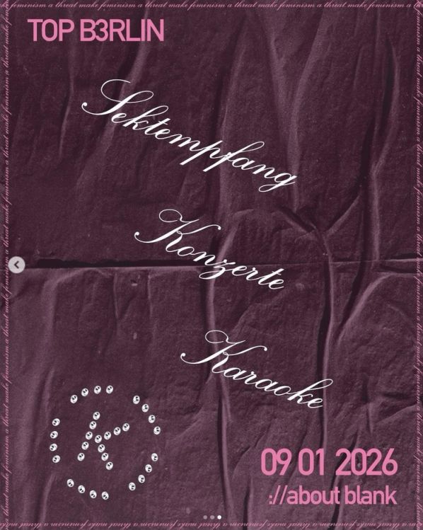 ist noch platz für ein paar neujahrsgrüße? ok: zuerst nach tbilisi in den tes club, in dem heute nacht die drei blankies c:ko, thnts und multifun spielen (check: https://de.ra.co/events/2339495) - ende des monats kommt der tes club dann zum gegenbesuch zu uns ins blank (tickets: https://de.ra.co/events/2328948). dann zwei dicke schmatzer aus der verwaschenen vergangenheit: ein mitschnitt des b2b von eva & marcel koar aus der silvesternacht zum nachspülen (listen: https://soundcloud.com/marcel-koar-wherehouse/eva-marcel-koar-blank-wahing) und das klatschnasse hybrid-live-drums-set von blank resident c:ko aka eastgermantechnopope (feuer frei: https://soundcloud.com/eastgermantechnopope/cko-nye-2026-about-blank-hybrid-with-live-drums). und zum dritten ein gruß in die zukunft: in zwei wochen wird die rundum-genießerin jovana reisinger zum auftakt der blank winter holidays in unserem wellnesszelt aus ihrem essay "pleasure" lesen - ein text über ausschweifung und des hungers nach konsum und radikalen wohlfühl-feminismus (tickets: https://www.tixforgigs.com/de-DE/Event/70652/jovana-reisinger-pleasure-about-blank-berlin). gesundes neues!