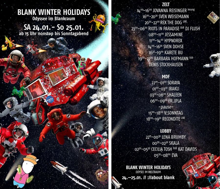 der weltraum. unendliche weiten. 13,6 milliarden jahre nach dem urknall navigiert das ://about blank im sternzeichen roter wohnwagen von wurmloch zu wurmloch, immer auf der suche nach der bestmöglichen welt und doch nie mehr als eine flotte raumzeitkrümmung von der verstrahltesten party der galaxis entfernt. raver*innen an den mobilen endgeräten, verlasst eure winterlichen tiefschlafkammern, es ist wieder soweit: blank winter holidays! 32 stunden schwerelosigkeit im muckeligen multiversum am ostkreuz. mit hologrammen zum wohlfühlen, schillerndem spiralnebel, schwarzen löchern, stars und sternchen, umlaufbahnbrechender science-fiction-house-musik und einer reichen auswahl bunter astronautennahrung. die blankies beamen euch rauf. zur auftaktzündung liest jovana reisinger aus ihrem lustspielerischen "pleasure". danach party auf drei floors von samstagnachmittag bis sonntagabend odyssee im blankraum ohne rückfahrschein.