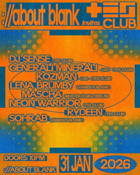 dj sense (tes club) // generali minerali -live- (tes club) // kozman -live- (tes club) // lena brumby (://about blank) // mascha (muster / cura berlin) // neon warrior (tes club) // rydeen (tes club) // sohrab (://about blank)